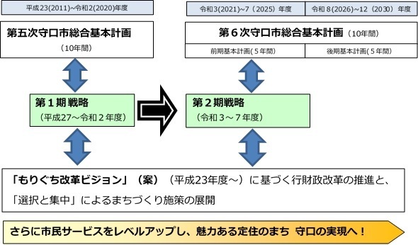 令和3(2021)年度を始期とする市の最上位計画である「第6次守口市総合基本計画」(以下「総合基本計画」という。)が策定されたことから、総合基本計画の実現に向けた一つの個別計画としての位置づけのもと、総合基本計画との整合性に配意しつつ、新たな本市の地方創生(=守口創生)の戦略を示すため、第2期戦略を策定しました。