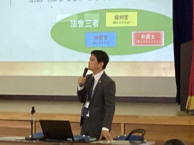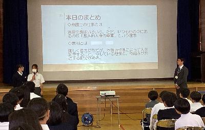 そこで、八雲小学校5年生と八雲中学校1年生を対象に、守口市役所で法務専門官としてお勤めの脇田俊宏弁護士より「弁護士ってどんな人?~私の職業と社会とのつながり~」と題してお話をしていただきました。