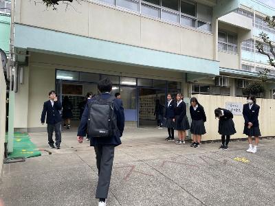 中学生が小学校の門にも立ち、登校してくる児童を笑顔で迎えました。