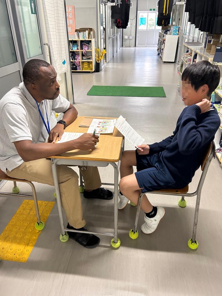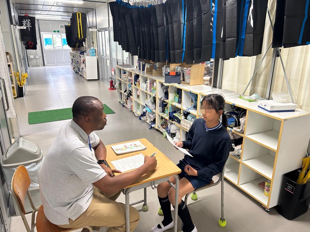 6年生がジンベル先生(第一中AET)と英語を使ってコミュニケーションをとっていました。今日のテーマは「夏休みの思い出を伝えよう」です。マンツーマンということもあって、少し緊張した様子の児童もいましたが、手を挙げながら「Hi」と話しかけて笑顔で会話を始める児童もいました。このような経験を積み重ね、外国の方とのコミュニケーションに自信を持っていってくれればと思います。