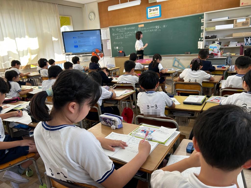 夏季休業期間中の研修で、感情が表情や姿勢をつくる一方、表情や姿勢が感情をつくることが脳科学的に実証されていることを学びました。特に、姿勢が感情に与える影響が大きいそうです。3年生の教室をのぞくと、子ども達の姿勢から学ぼうとしている気持ちが伝わってきました。子ども達には、何事にも常によい姿勢で臨む習慣を身に付けてほしいと思います。
