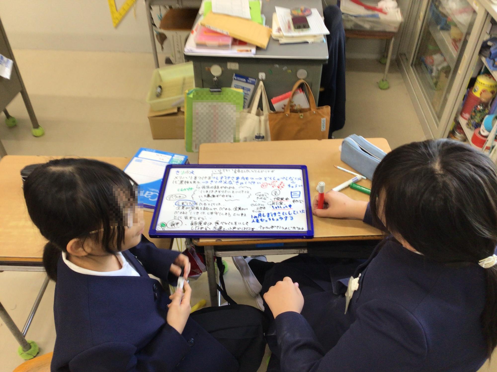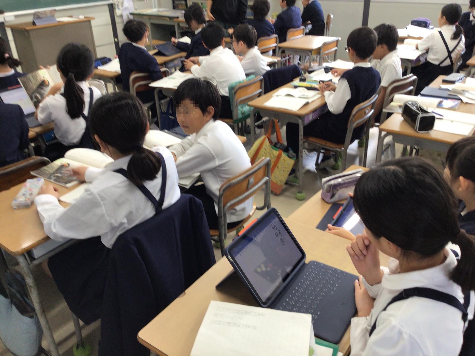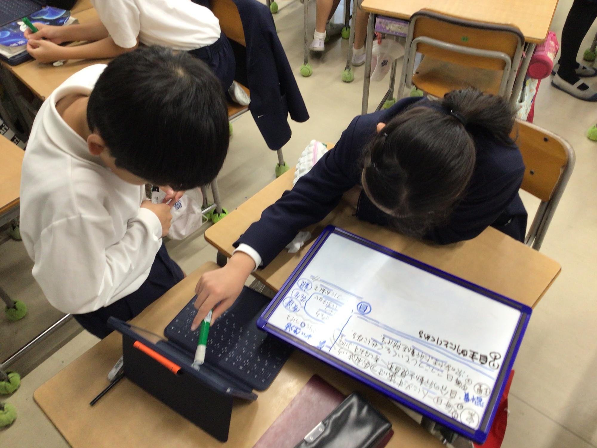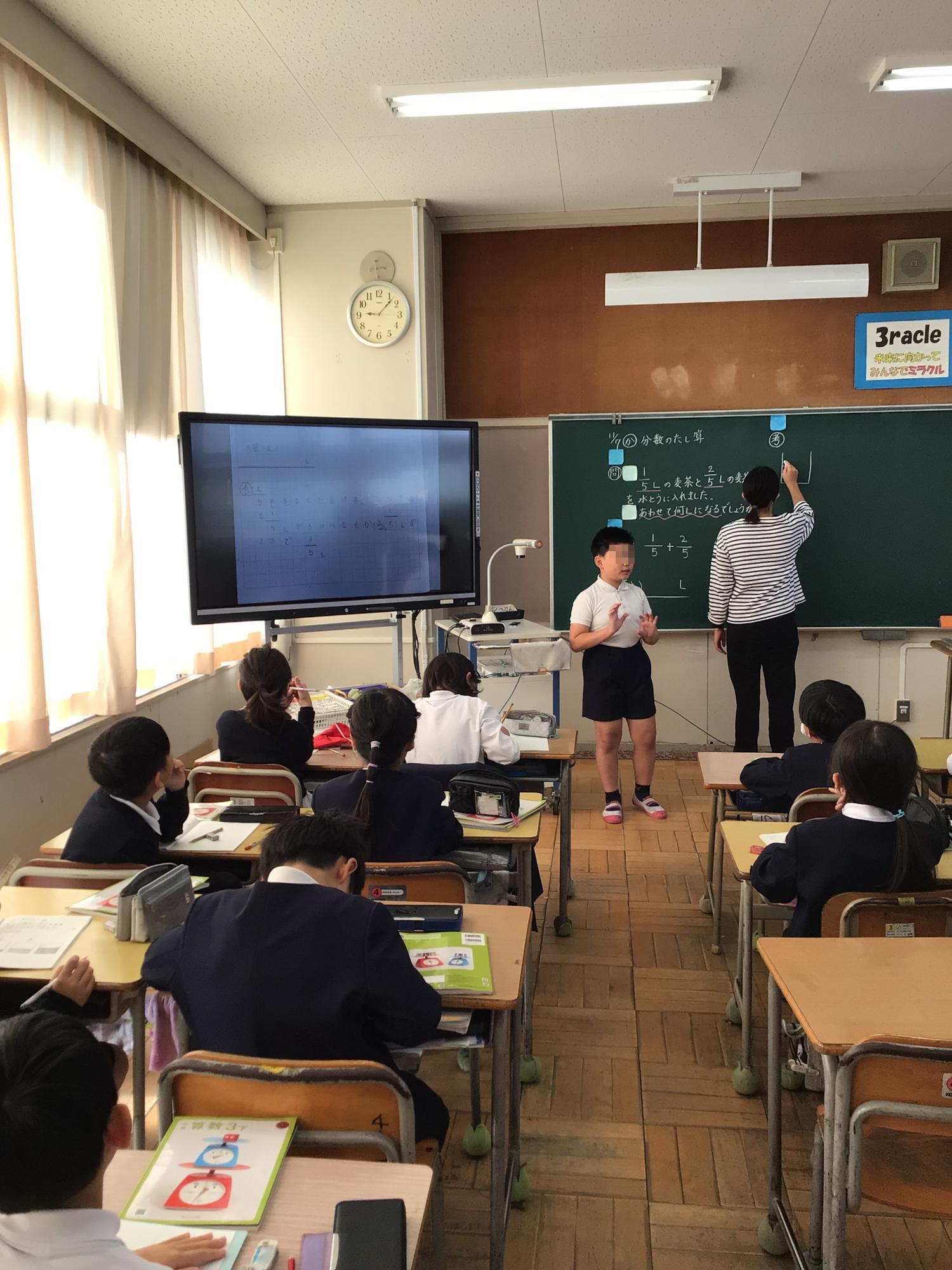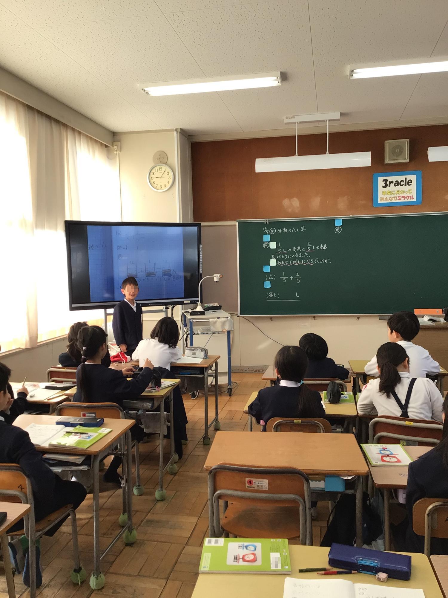 3年生の子ども達が代わる代わる分数のたし算の考え方を説明し合っていました。自分の考えをアウトプットすることは、きわめて効果的な学び方の一つです。一方、5年生の子ども達は、日常生活の課題を解決するための行動等について、自分達で選んだタブレットPCやホワイトボードなどのツールを使って、まさに「熟議」していました。どちらも学習を楽しんでいる様子でした。これらのような学び方を身に付けながら、子ども達が学ぶことの楽しさを感じてくれると嬉しく思います。