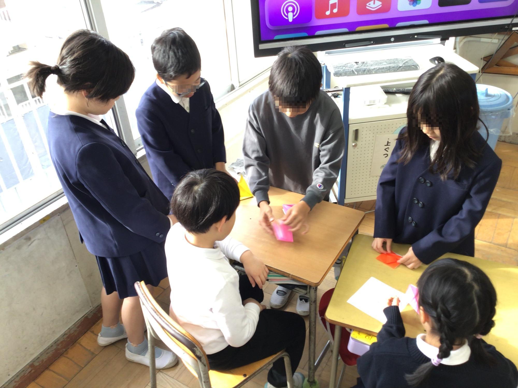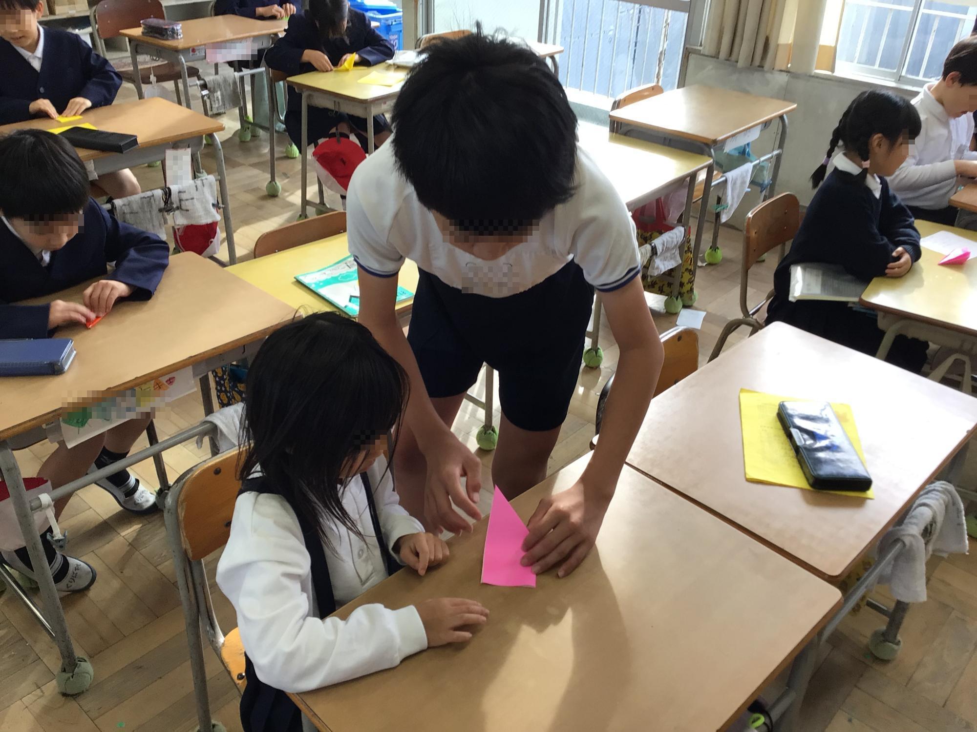 今日の6年生のようすです。朝のなかよしタイムでは、修学旅行先の平和記念公園で捧げる千羽鶴をつくるため、最高学年として折り鶴をつくる目的や方法を、下級生の子ども達に優しく丁寧に教えていました。午後には、第一中学校のクラブ体験に参加しました。最も年下の下級生として、先輩から優しく丁寧に教えてもらっていました。今日の一日は、6年生の子ども達の大きく違った2つの姿を見ることができました。