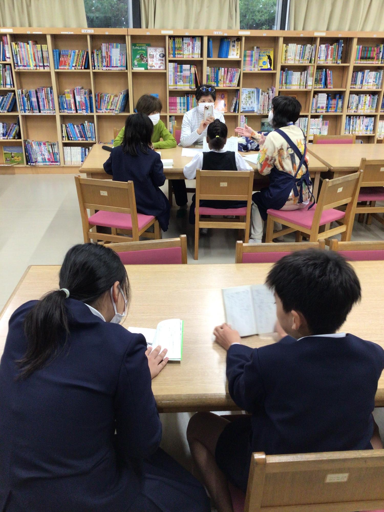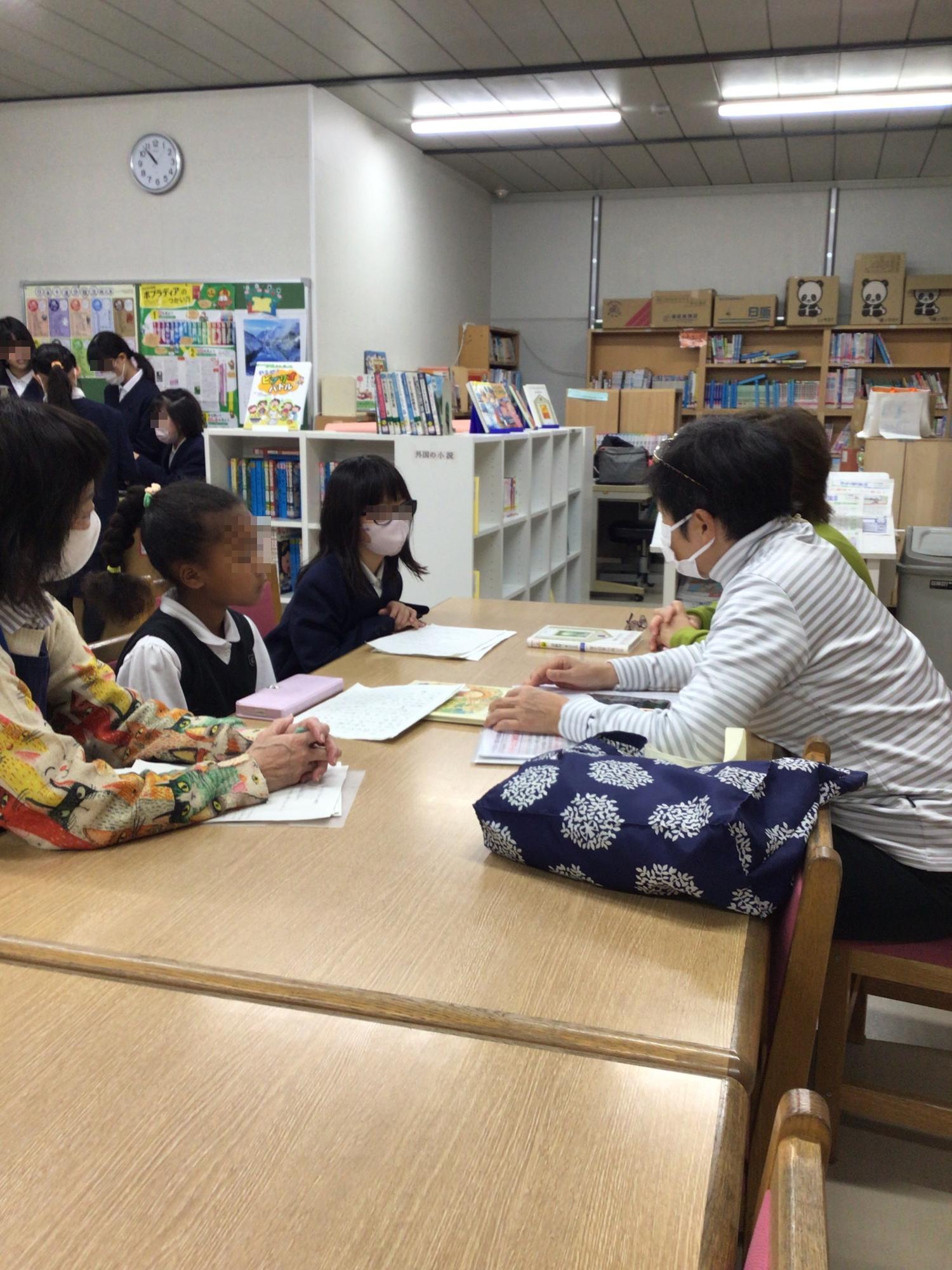 休み時間の図書室では、ビブリオバトルに挑戦する児童と学校司書、学校運営協議会委員の方々が、出場に向けた準備の打ち合わせをしていました。