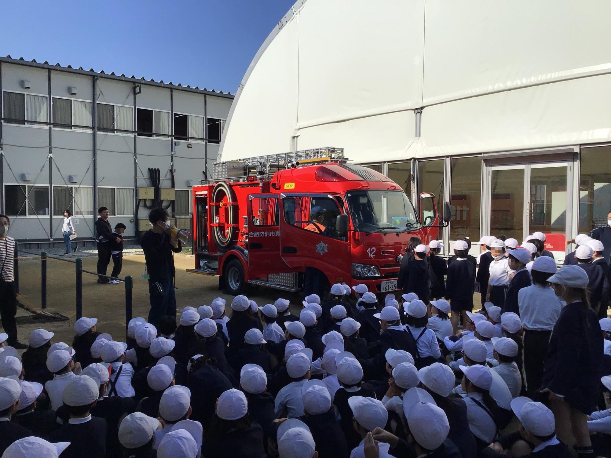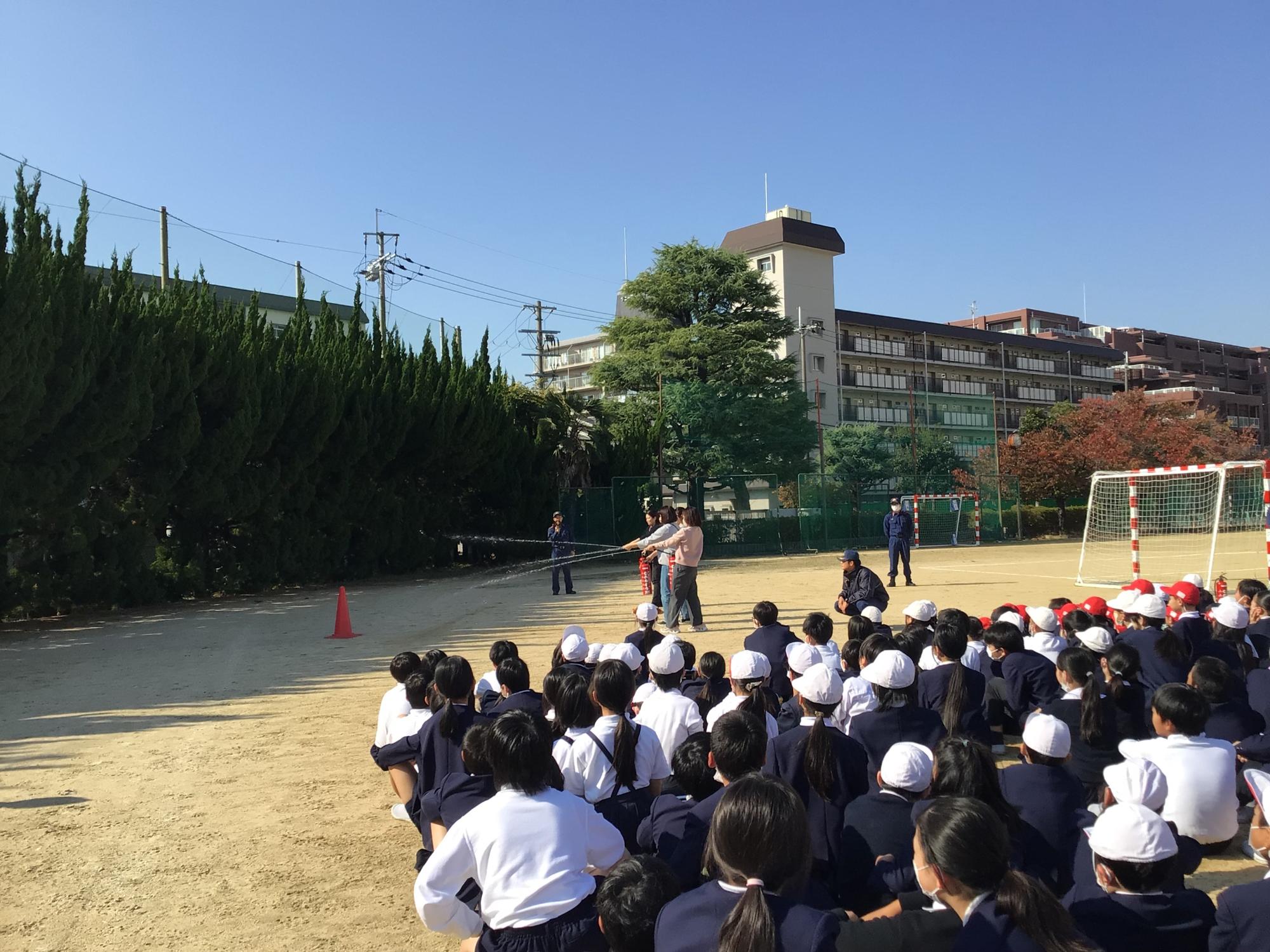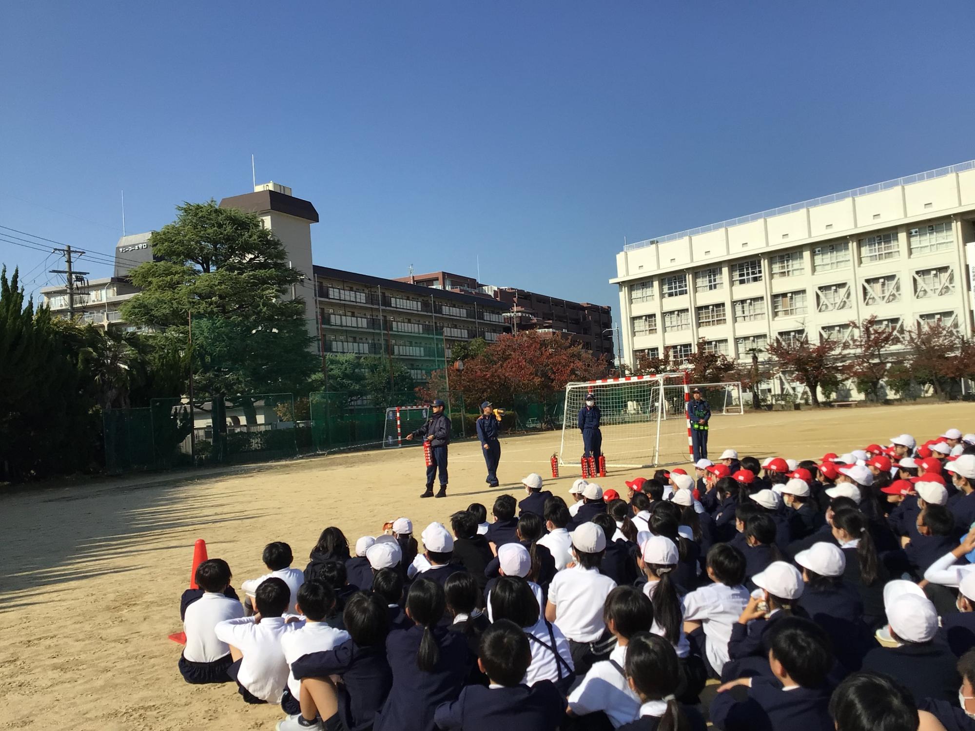給食室での出火を想定した避難訓練を行いました。今回は実施日を予告せずに期間を設け、子ども達はいつ避難訓練が行われるのか知らない状況で行いました。万が一の発災時に慌てずに行動できる力をつけるためです。来ていただいた消防隊員の方から、避難行動時の子ども達の姿勢を褒めていただくとともに、消火器の使い方や避難時の留意点などを教えていただきました。