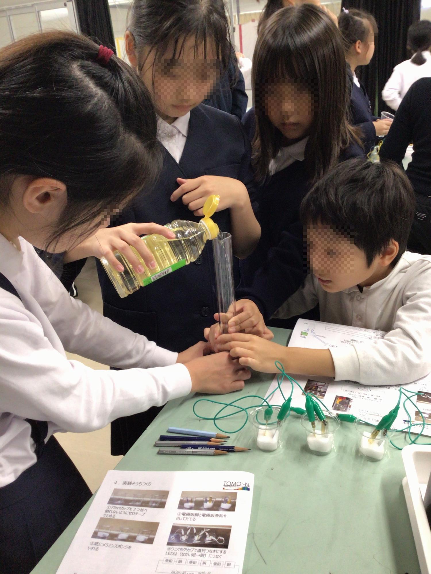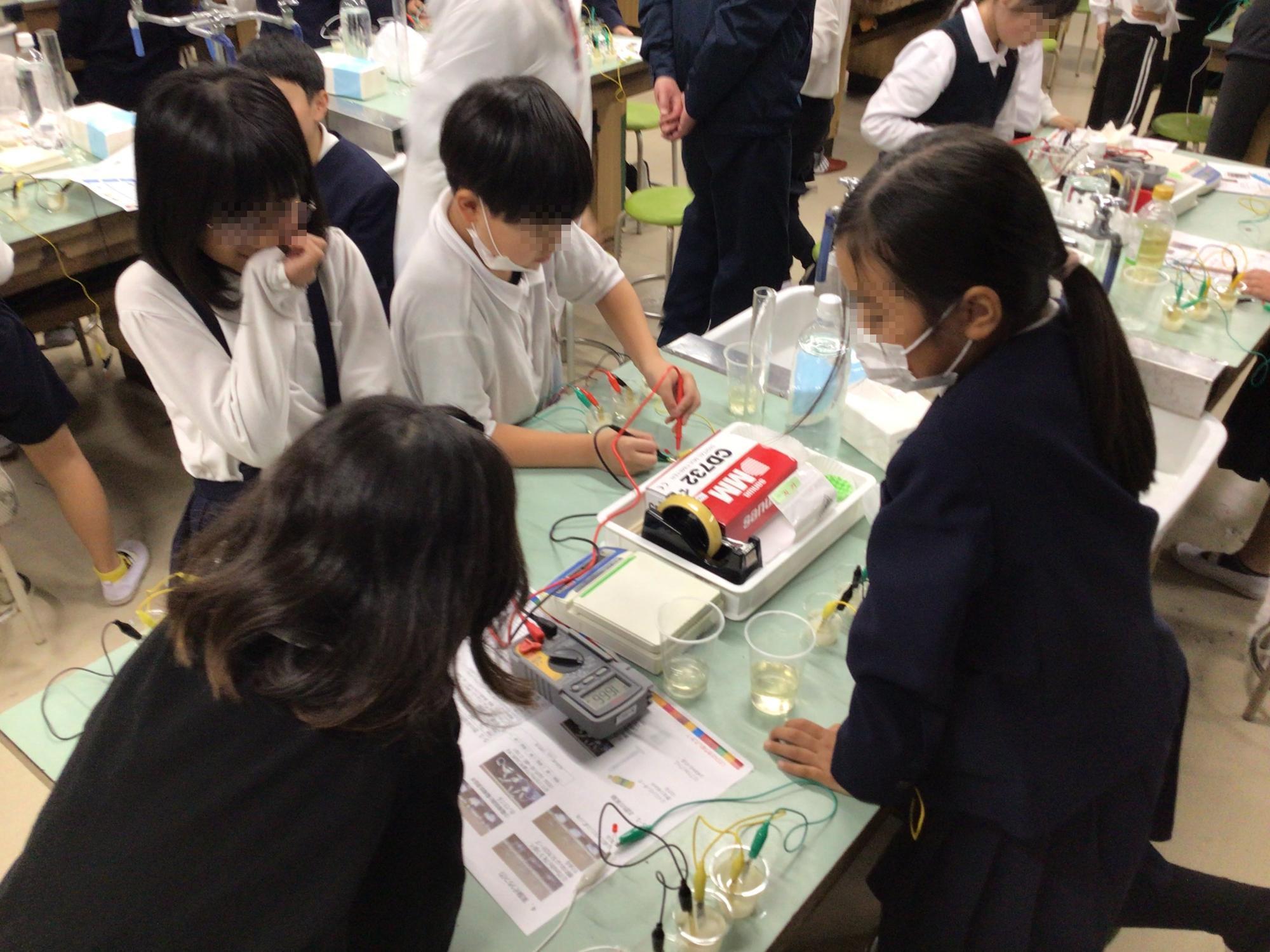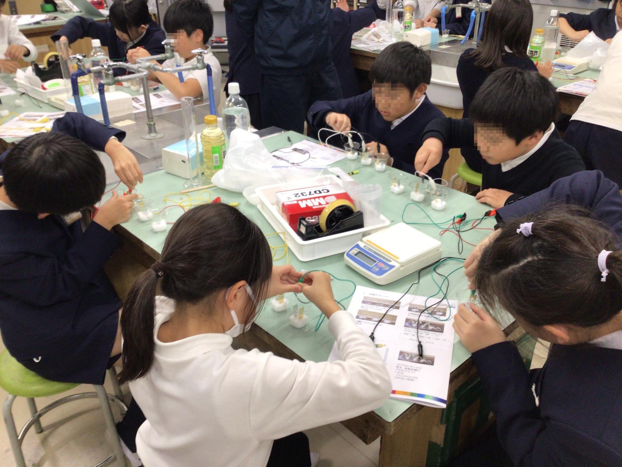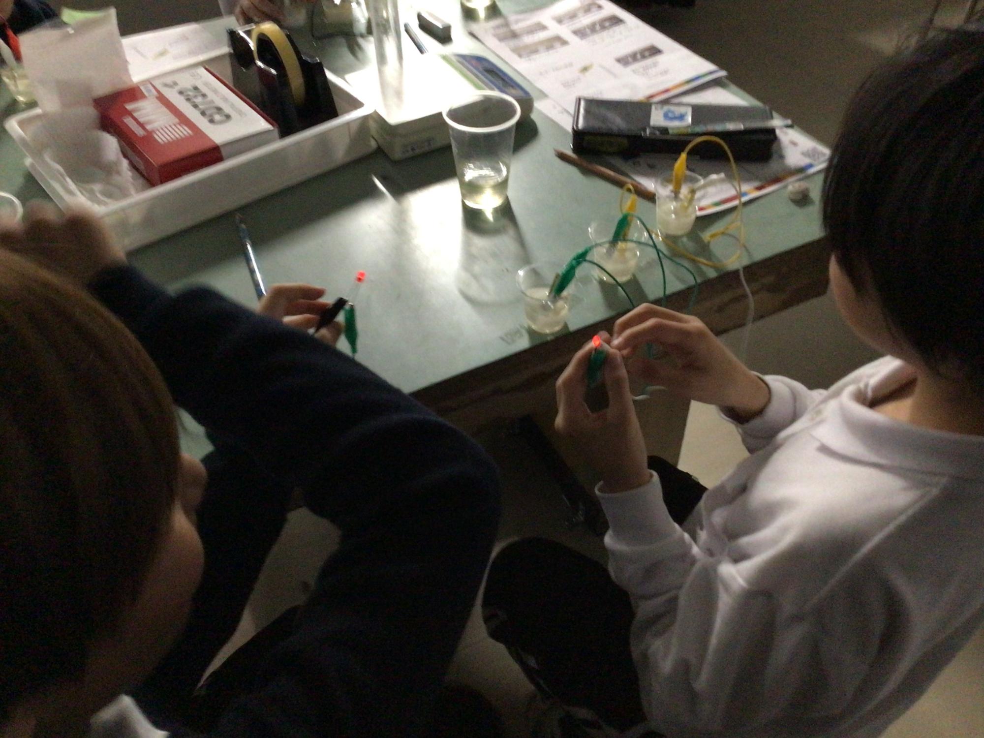 2学期の「夢と志を育むサイエンスチャレンジ」が始まりました。今日は、水溶液の違いによって、電気はどのように流れ方が変わるのかを調べて、電池の仕組みを学ぶ授業でした。直列つなぎをした電極版銅と電極版亜鉛の入った容器に、普段は料理で使うお酢を入れると・・・。ほのかに点灯し始めたLEDの光を、4年生の子ども達は不思議そうに眺めていました。