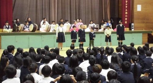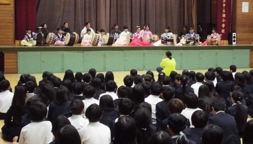 韓国朝鮮にルーツのある児童が、全校児童の前で「ヨンナム サムルノリ」を発表しました。発表の後は全員で「メッセージ」を合唱しました。一人ひとりのルーツを大切にして、お互いが認め合える環境を今後も築いていきたいです。