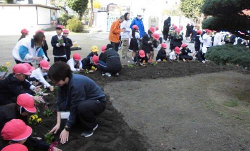 「桜の園」さんにご来校いただき、1年生がパンジーの苗を植えました。一緒に「ジャンボリミッキー!」のダンスを踊り、お礼に「さんぽ」を歌いました。きれいなお花をありがとうございました。