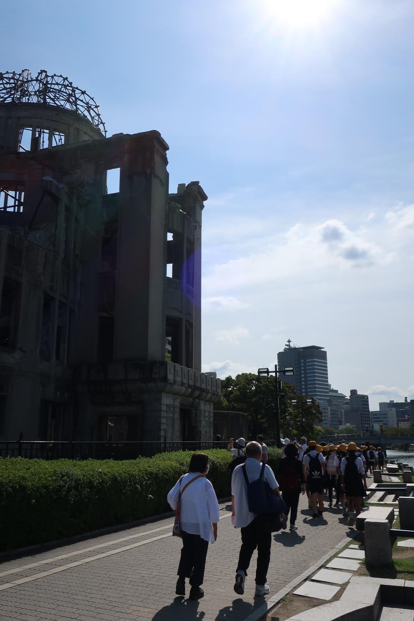 昼食の後はボランティアガイドさんから平和記念公園内を案内してもらいました。昔の写真なども見せていただきながら、詳しく当時の様子などについて教えていただきました。