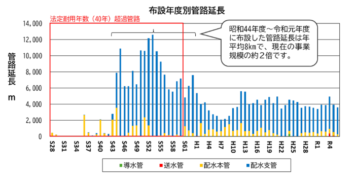 これらの管路が法定耐用年数(40年)を超過し、今後更新のピークを迎えようとしています。